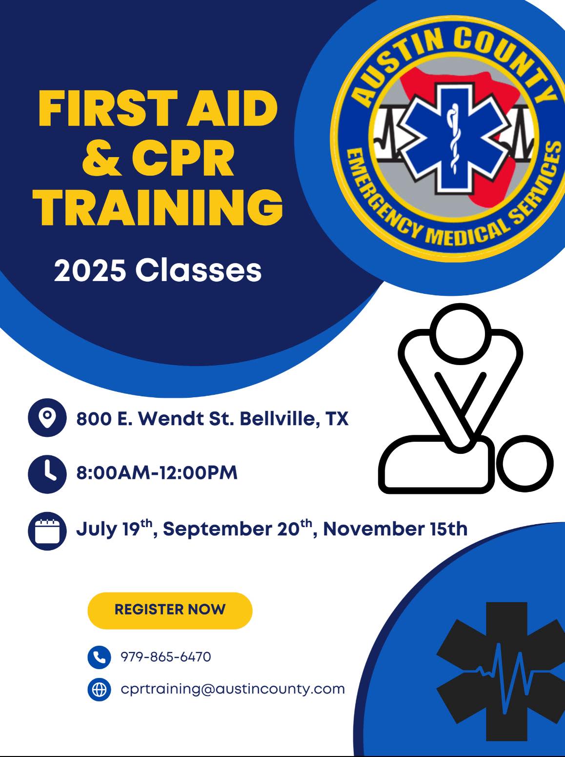 Learn life-saving skills at upcoming CPR/First Aid classes. βπ¨ Taught by the Austin County EMS staff, they bring experience and expertise to help you save a life. THREE classes schedule this year.