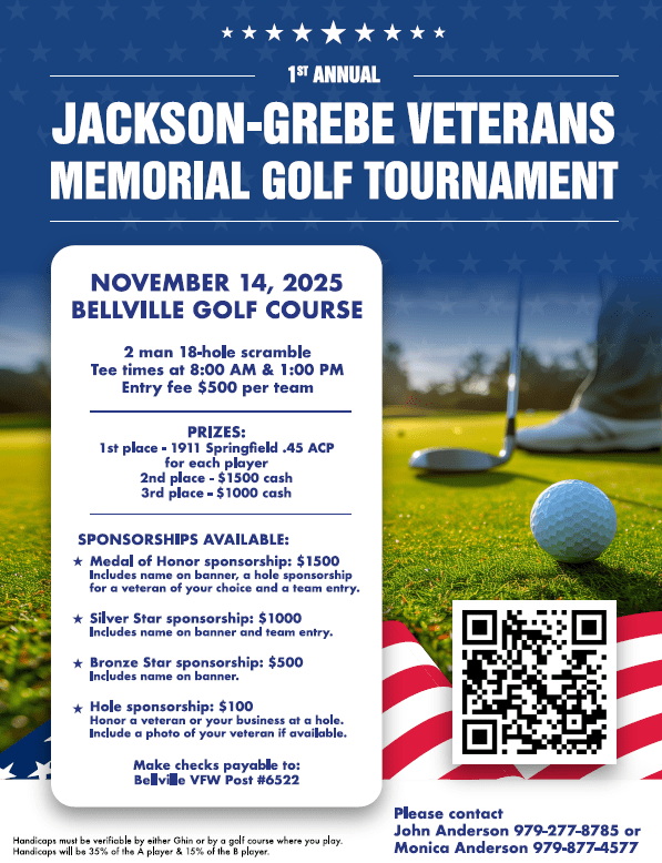 Hosted by Bellville VFW Post #6522. What: The 1st Ever Jackson-Grebe Veterans Memorial Golf Tournament. When: Friday, November 14, 2025. Where: Bellville Golf Course in Bellville, Texas. Format: The tournament is an 18-hole scramble with tee times at 8:00 a.m. and 1:00 p.m.. Entry fee: $500 per team. Cause: The tournament is a fundraiser for a veterans' causeImages