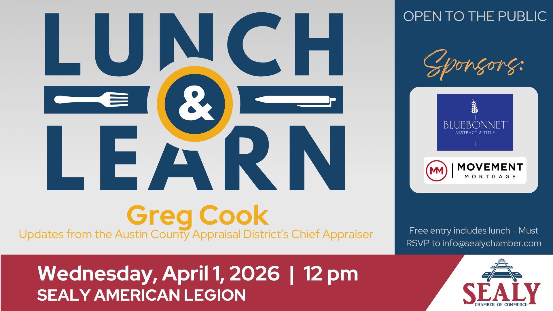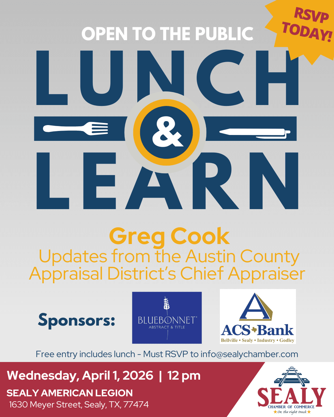 Lunch will be provided so please RSVP by the Friday before to receive a lunch. Thank you Sealy American Legion for the sponsorship of your hall for this event. This event will be sponsored by @Bluebonnet Abstract & Title: