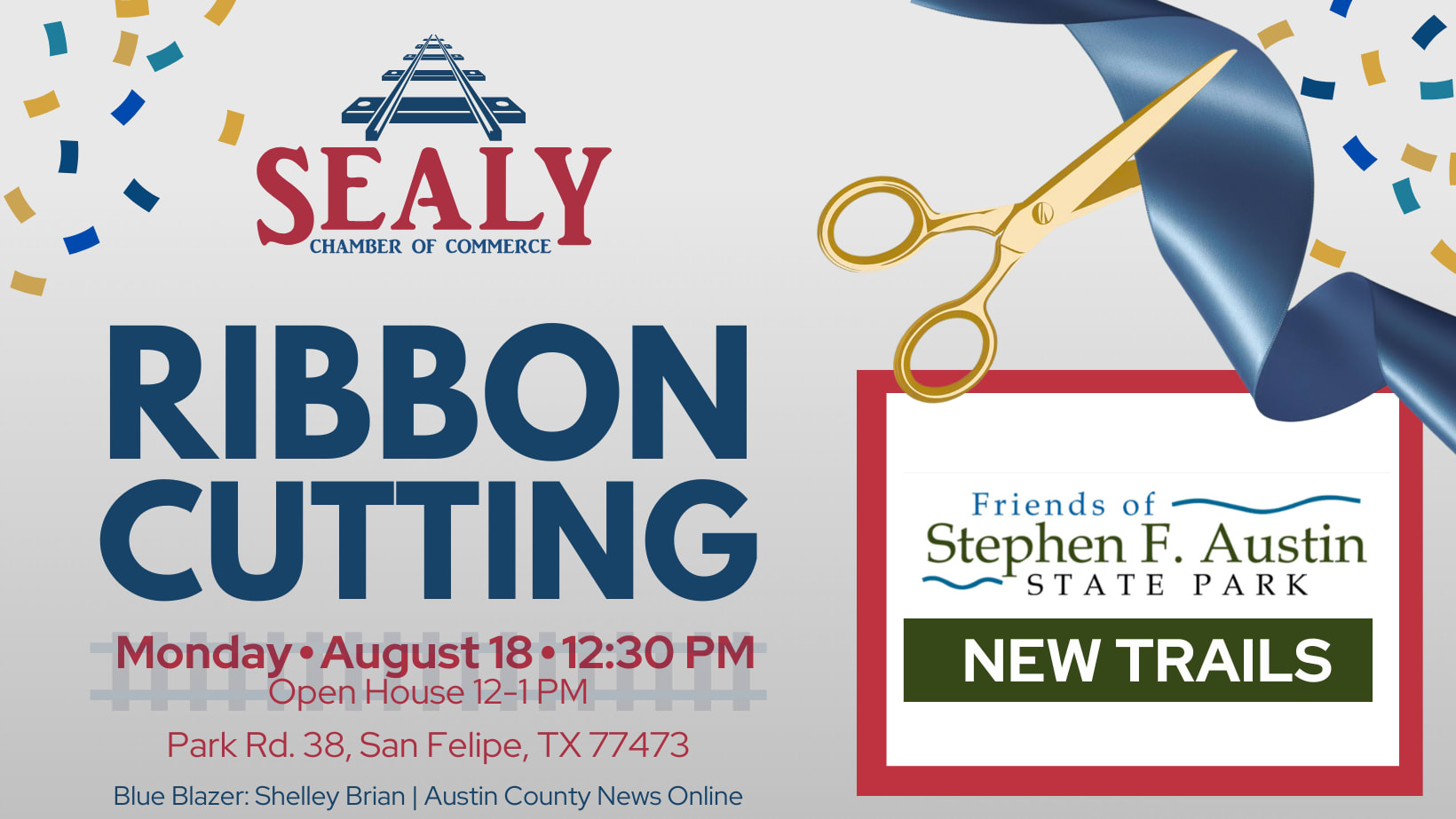 Please join us for a ribbon cutting in celebration of the new trails opening at Stephen F Austin State Park! All are welcome to join. Open House will be 12-1pm with the ribbon cutting at 12:30. Park Rd. 38, San Felipe, TX 77473 Free entrance for visitors attending the ribbon cutting. Guests may proceed past headquarters and go directly to the Nature Center. Easy directions to the park/Nature Center: Take I-10 East toward San Felipe Exit #723 for FM 1458 / Frydek Rd. Turn left onto FM 1458 Turn left onto Park Rd. 38 Continue past headquarters Cross the bridge over Bullinger Creek Turn left—the Nature Center will be on the right-hand sideImages