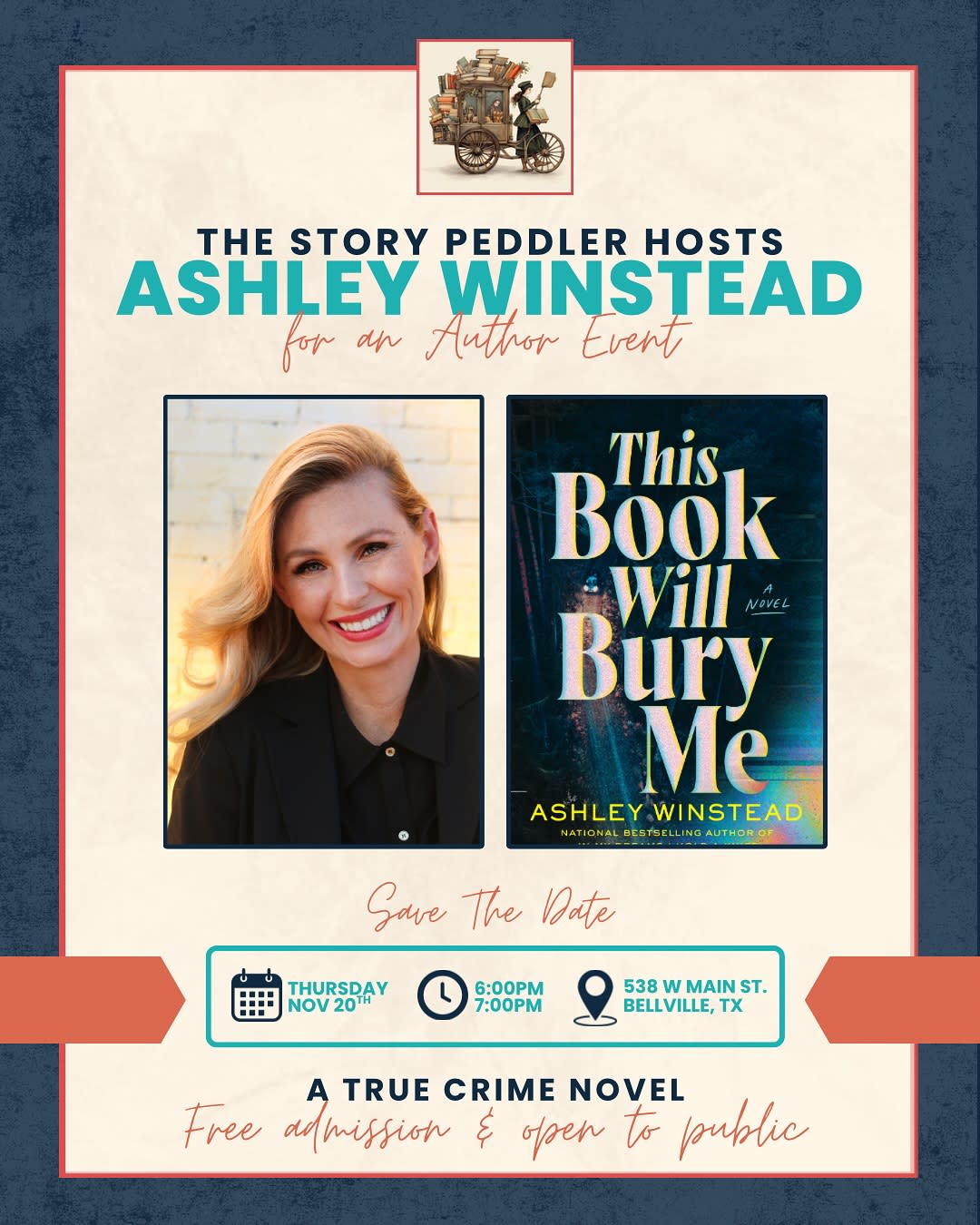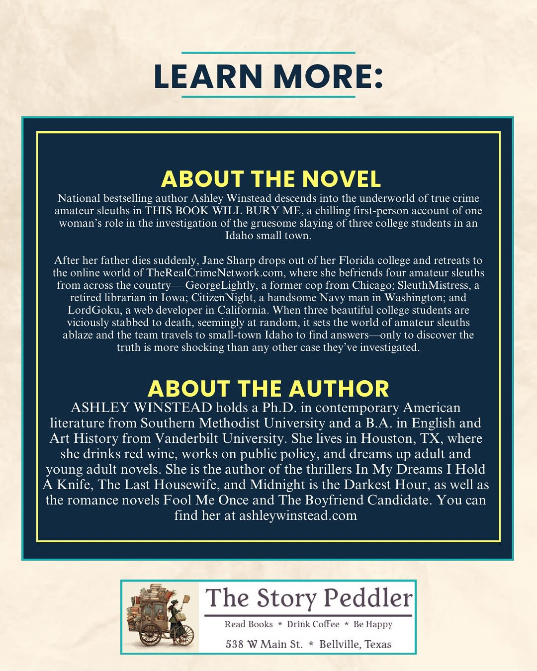 The Story Peddler will have copies of This Book Will Bury Me for sale for those attendees who wish to purchase a book, however, a purchase is not mandatory to attend the event. Our author events are always free and open to the public. Ashley will be available after her book reading and discussion to answer questions and sign purchased books. If you'd like to learn more about Ashley, you may visit her website at ashleywinstead.com.