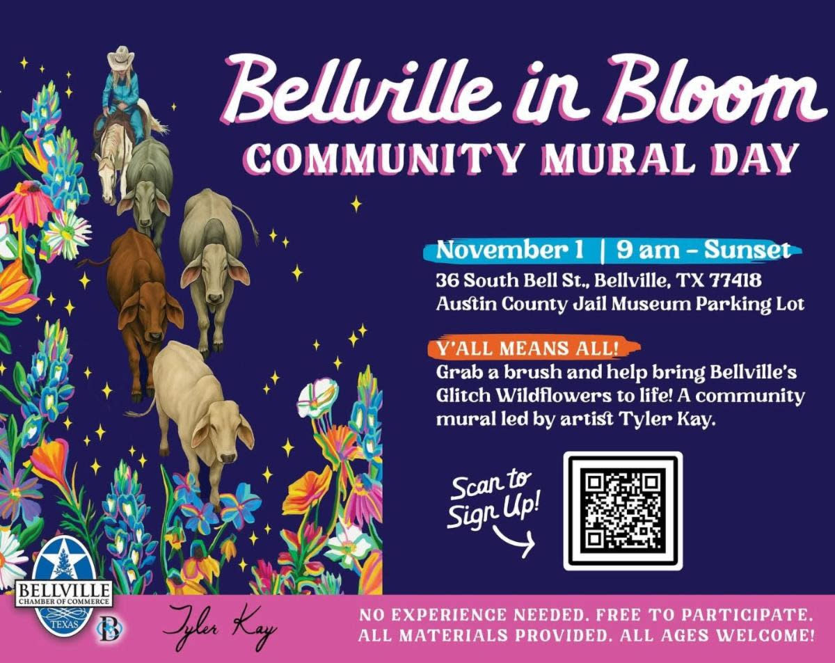 Grab a brush & help bring Bellville's Glitch Wildflowers to life! A community mural led by artist Tyler Kay. FREE to participate, ALL ages welcome! 🎨 No experience needed. 🌼 All ages welcome. 💖 Materials provided. 🤠 Y’all Means All!Images