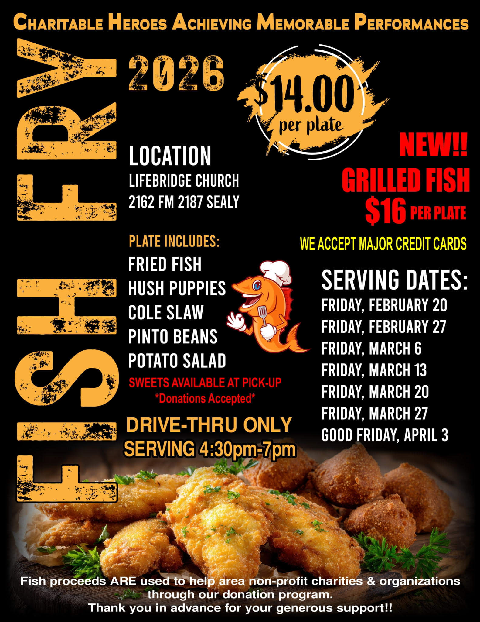 CHAMP announces the return of their annual Lenten Fish Frys, starting Friday, February 20, at LifeBridge Church (2162 FM 2187). Fish Frys will continue every Friday during Lent. Serving drive-thru only, from 4:30 to 7 pm, for only $14 a plate or $16 for grilled redfish.