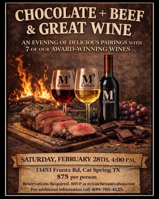 M3 CELLARS is bringing you another great event, this Saturday, February 28th...space limited, RSVP now! Chocolate, beef, and great wine—an evening made to savor 🍷 Join us for a decadent tasting experience featuring award-winning M3 Cellars wines, perfectly paired bites, and a warm ranch atmosphere Reservations required. Email m3ranchtexas@yahoo.com or call 409-781-4125 to reserve your spotImages