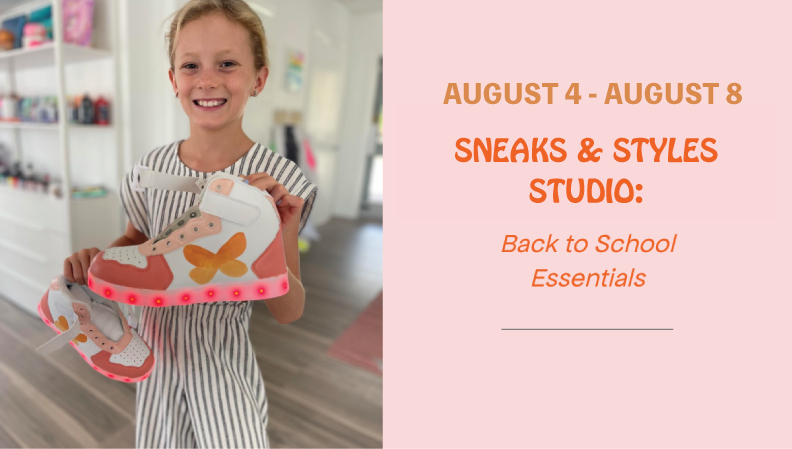 k-8th. Painted sneaks and back to school swag. In this creative camp, students will customize their own sneakers with paint designs, trendy laces, and the hottest shoe charms to create totally unique kicks. They will create backpack bling that stands out, and transform boring school supplies into personal style statements! Each day brings new ways to add sparkle and style to school essentials, ensuring every camper starts their school year with confidence and flair.