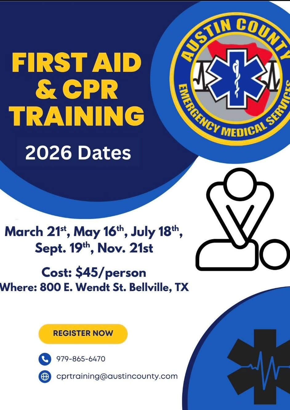 Learn life-saving skills at upcoming CPR/First Aid classes. βπ¨ Taught by the Austin County EMS staff, they bring experience and expertise to help you save a life. Several classes scheduled this year.