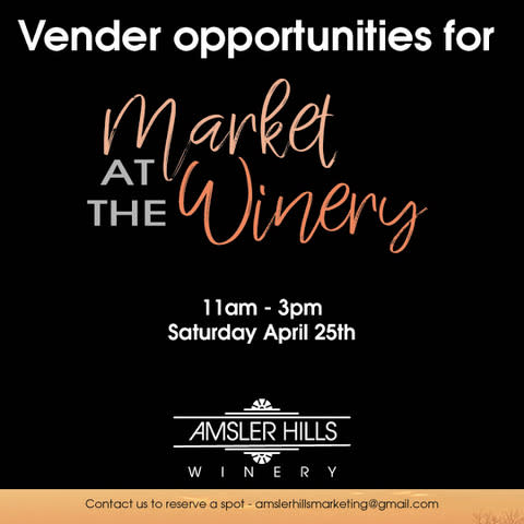 Join Amsler Hills Winery for our inaugural Market at the Winery April 25, 2026. We are now accepting applications for vendors! Email amslerhillsmarketing@gmail.com for more information.